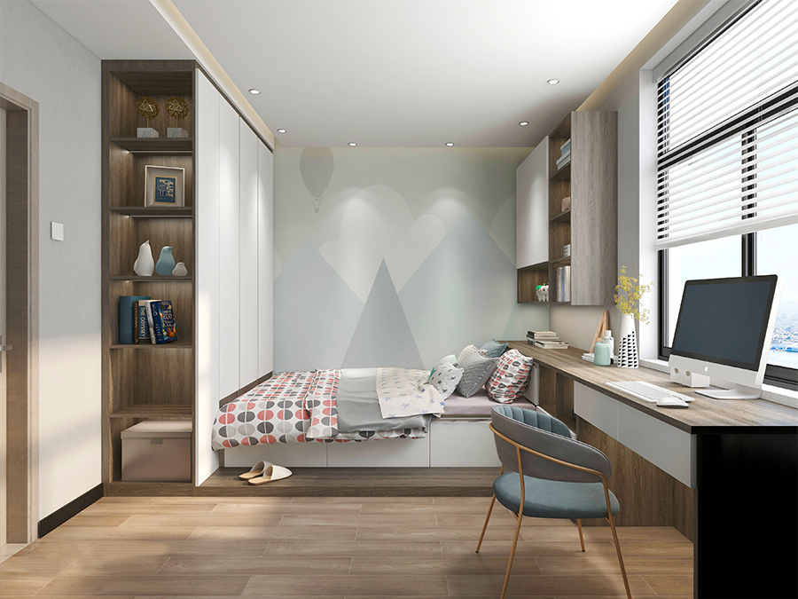 書桌的設計改變了榻榻米房常規(guī)的做法,將休息區(qū)、學習區(qū)與儲衣區(qū)有效分開,但整體又是聯(lián)系在一起的,衣柜的開放區(qū)與書桌接連,用統(tǒng)一木紋色,一側的儲物柜臺面也是木紋色的,凸顯空間的層次感。