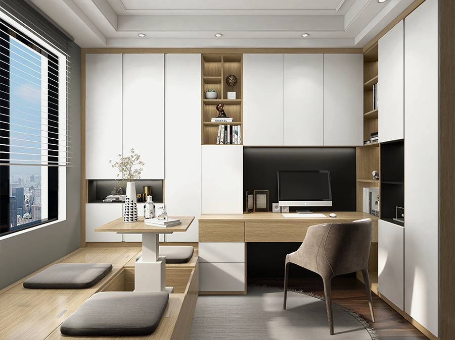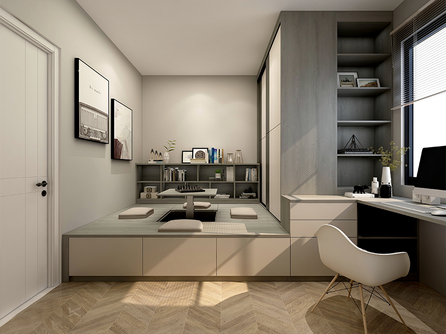 連著榻榻米一起做書桌柜一體式設計,白色加原木紋色帶來簡潔的開闊感,半開放設計使得空間的使用更加靈活便捷。