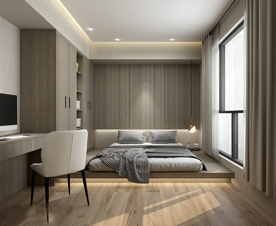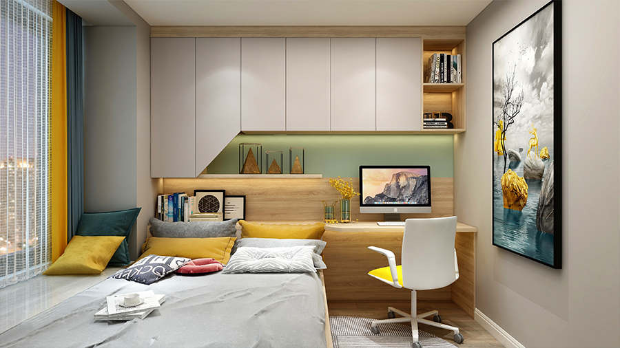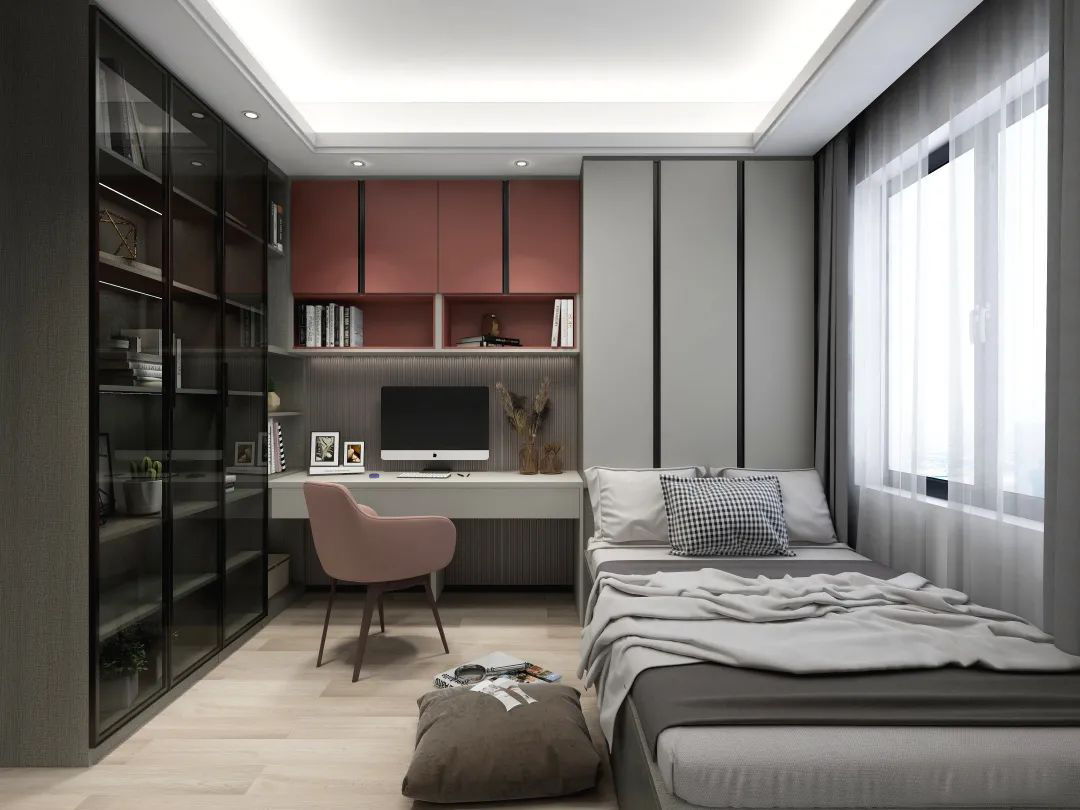 從榻榻米到柜子,再到書桌,統(tǒng)一花色設計,加上合理分區(qū),有種簡單脫俗又隨性自在的氛圍感,整體素雅又不失高級。