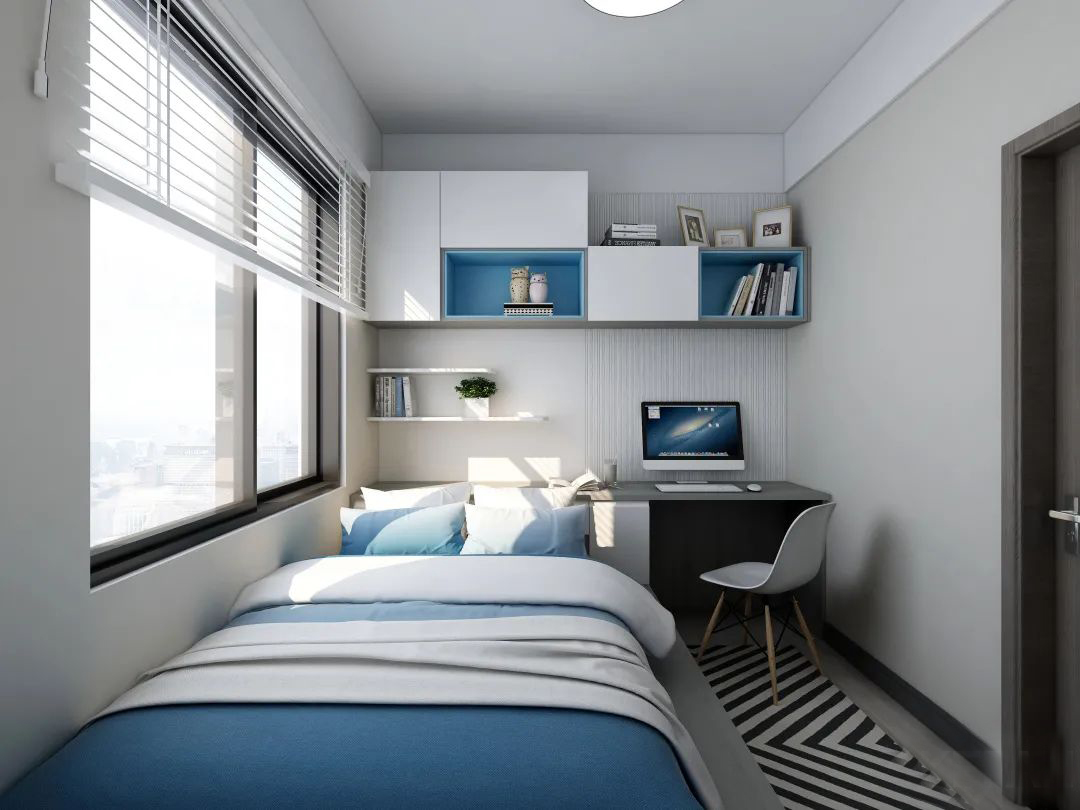 沒有跳脫的顏色,讓淺色系列在這里自由發(fā)揮,藍色的書籍和圈圈點點的被褥都可以發(fā)揮自己的獨特,簡約清新的空間包容性極強。