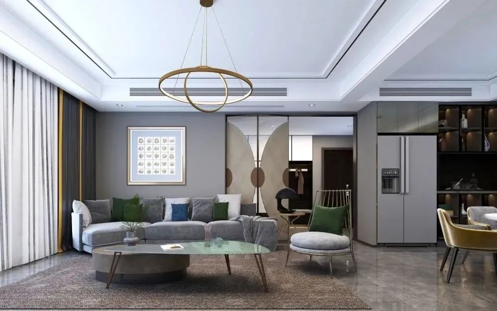 輕奢風(fēng)一般用中性色做主色調(diào),玻璃和金屬元素的加入,也增強(qiáng)了輕奢感。
