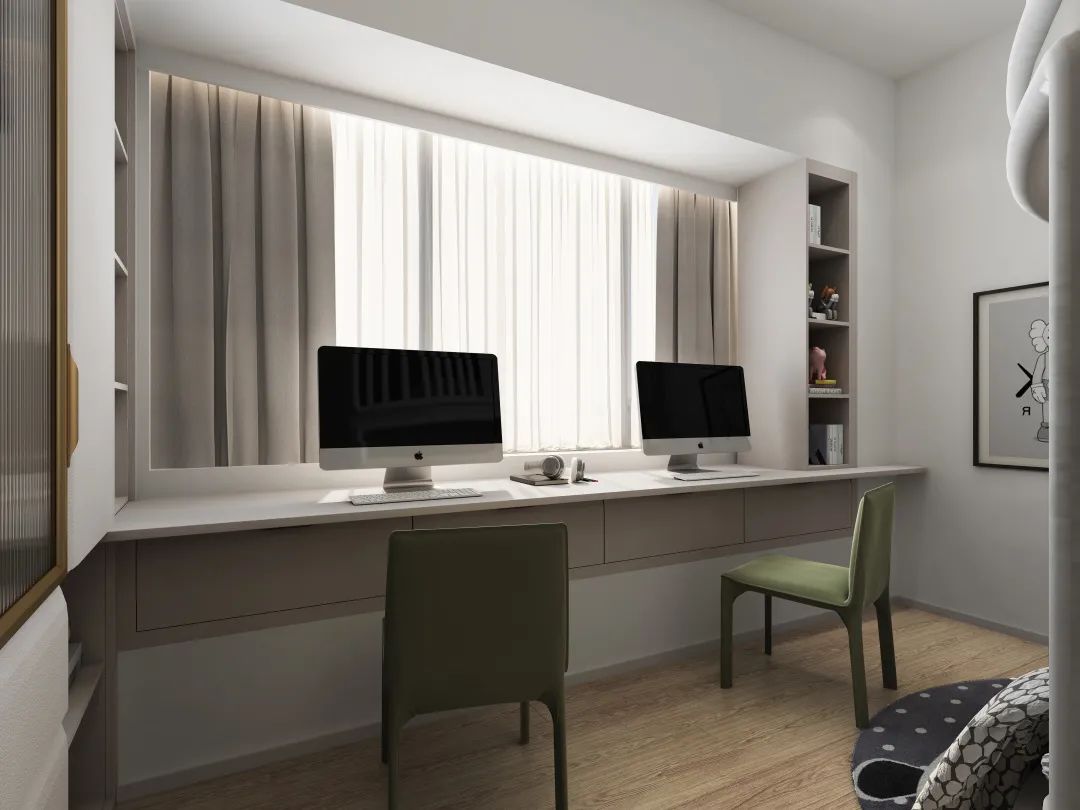 除了增加書(shū)桌臺(tái),飄窗兩邊也可以適當(dāng)?shù)脑O(shè)計(jì)展柜書(shū)柜,充分利用墻面空間擴(kuò)容收納。如果臥室實(shí)在太小,小到延伸書(shū)桌的空間都很難挪出來(lái),那不妨做一個(gè)折疊書(shū)桌。