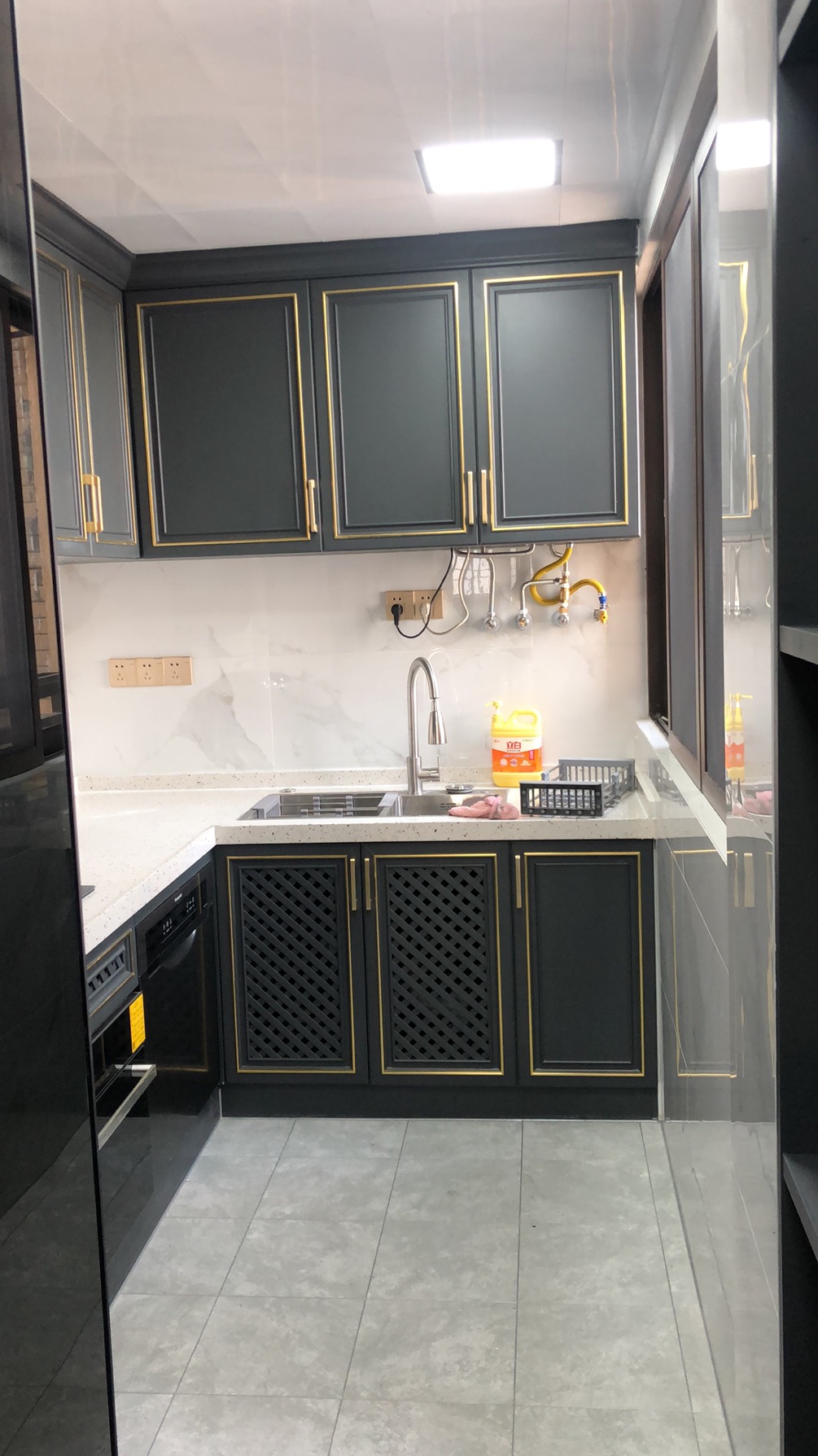 用金色邊框點(diǎn)綴,空間的藝術(shù)氛圍呼之欲出。高級(jí)灰廚房打造的視覺(jué)效果,并非單一而枯燥,利用材質(zhì)的搭配、燈光的效果、配色的點(diǎn)綴,一樣將高級(jí)灰廚房打造地萬(wàn)種風(fēng)情。